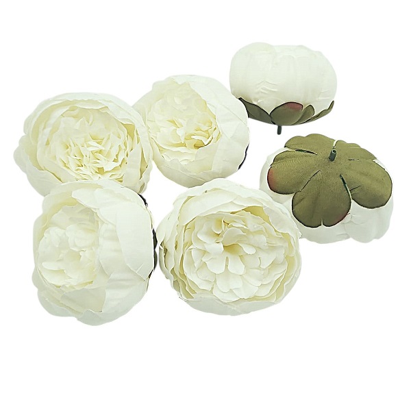 Capete de flori artificiale tip bujor, cu diametrul de 8 cm, realizate pentru utilizare profesională în florării și activități de decor. Culoarea ivory oferă un aspect elegant și versatil, ușor de integrat în aranjamente florale clasice sau moderne. Setul conține 6 bucăți, fiind eficient pentru producție și revânzare.