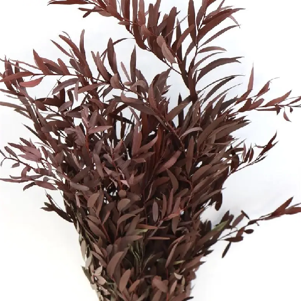 Eucalipt conservat, specie Parvifolia, frunze micuțe alungite cu codita scurta, culoare roșu închis, lungime medie cca 75cm. Planta conservata ideala pentru creații decorative. Tablouri, panouri sau aranjamente florale (mărțișoare, buchete mireasa, lumânări nunta, lumânări botez, si a altor decorațiuni pentru nunti sau pentru acasă). Minunat in buchete de mireasa cu flori criogenate, conferă un contrast delicat prin forma frumoasa a frunzelor.