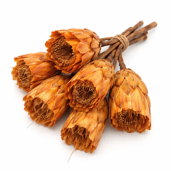 Floare naturala tropicala uscata Protea in frumoase nuante de galben si portocaliu natur.