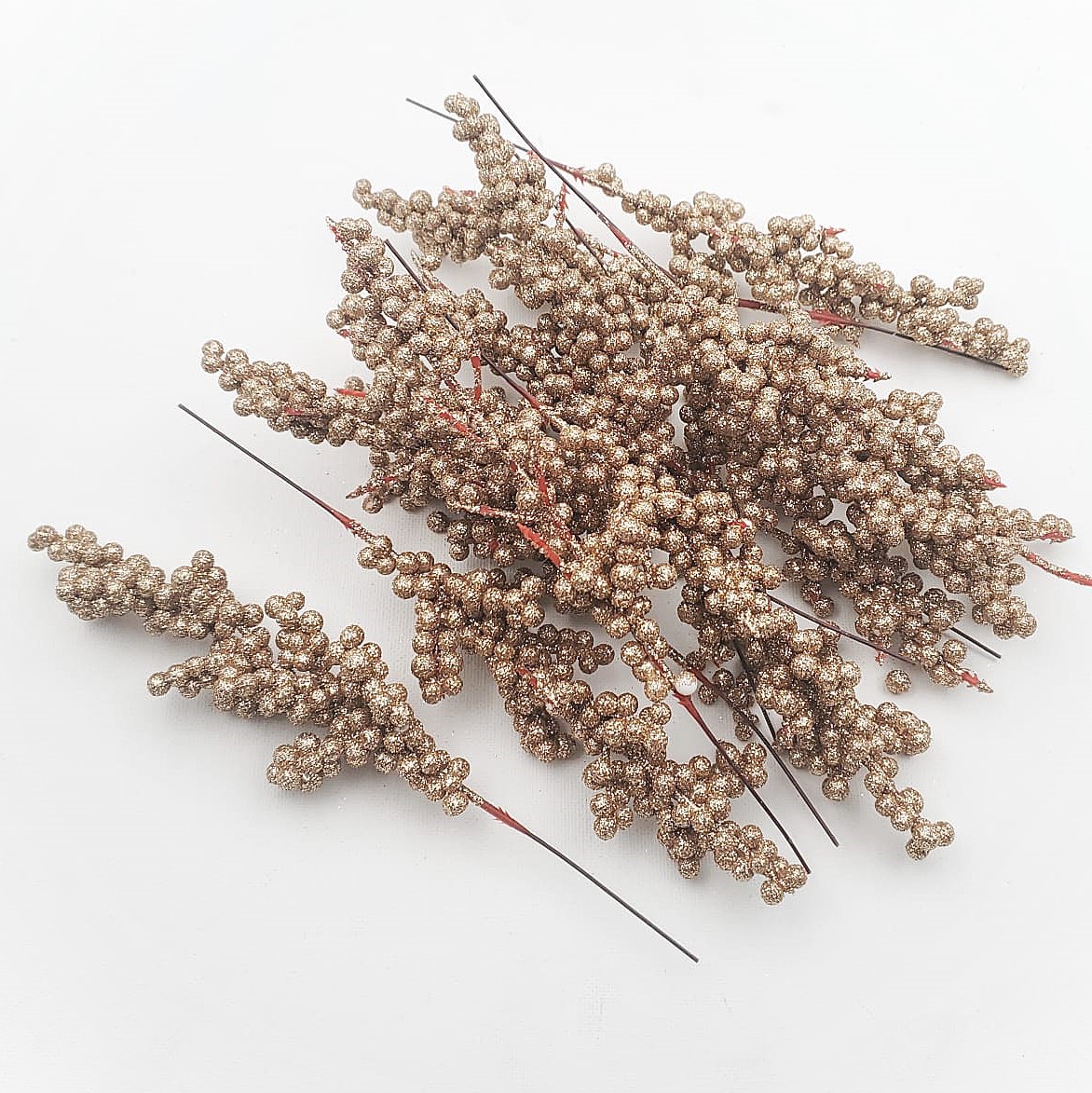 O frumoasa Decorațiune de Crăciun, Crenguța cu fructe artificiala in nuanțe de șampanie si sclipici. Ideala in confecționarea coronițelor de Crăciun si altor decorațiuni festive.